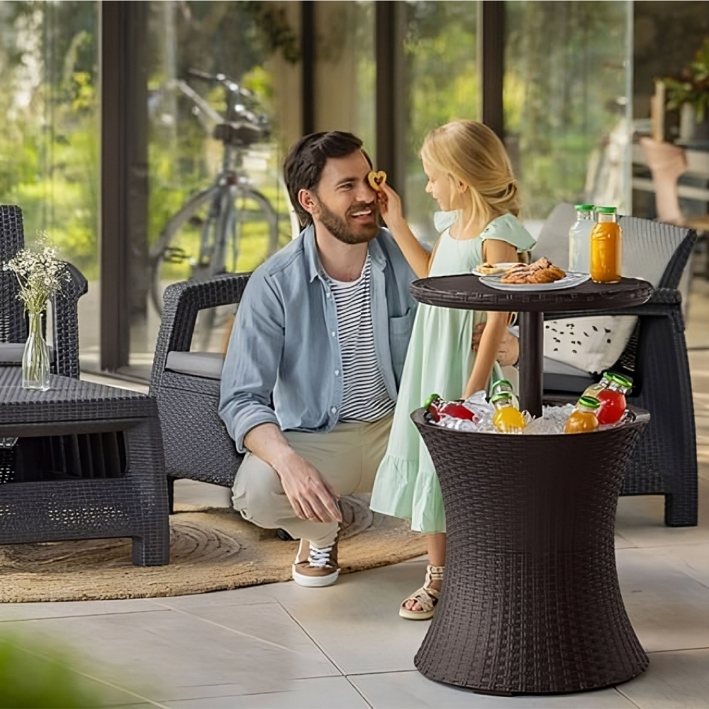 Funkcionalus šaltkrepšis, kuris uždarytas tampa itin patogiu staliuku. Elegantiško dizaino, puoštas pynimo rašto imitacija Cool Bar Rattan saliukas-šaltkrepšis yra puikus sprendimas organizuojant sodo vakarėlius su šeima ar draugais.