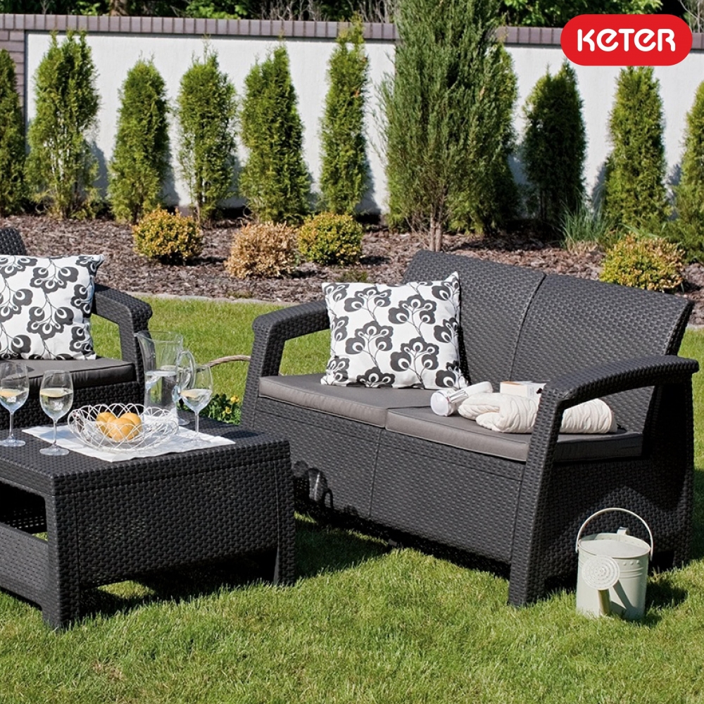 100 % polipropilenas, pagaminta Europoje. Smėlio, pilkos arba rudos spalvos.Stilingas Corfu poilsio komplektas užtikrina didžiausią patogumą. Komplektas pasižymi moderniu dizainu, įkvėptu pintos vytelės. Tvirta ir gerai apgalvota komplekto konstrukcija užtikrina stabilumą ir optimalų naudojimosi patogumą. Komplektą sudaro dvivietė sofa, du krėslai ir staliukas. Baldai yra atsparūs nepalankioms oro sąlygoms. Pagaminta iš 100 % polipropileno, Vengrijoje, gamintojas – Curver.