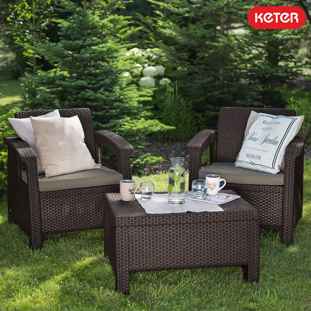 100 % polipropilenas, pagaminta Europoje. Grafitinės arba rudos spalvos.Grožis ir elegancija viename komplekte. Kompaktiška rėmo forma ir optimalūs komplekto matmenys leidžia apstatyti net ir mažesnes sodo ar balkono erdves. Komplektą sudaro staliukas ir du krėslai su pagalvėlėmis. Elegancija, patogumas ir ergonomiškas dizainas garantuoja malonų poilsį lauke. Paprastas surinkimas ir priežiūra yra papildomi šio komplekto privalumai. Pagaminta iš 100 % polipropileno, Vengrijoje, gamintojas – Curver.