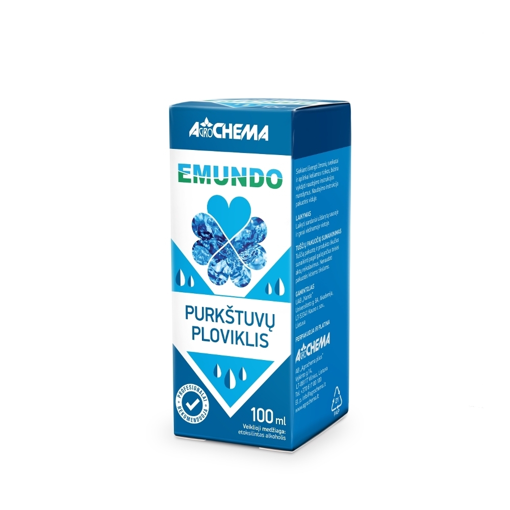 Naudojimo rekomendacijos: iš karto po purškimo ištuštinkite purkštuvo baką. Išplaukite purkštuvo vidų su švariu vandeniu, pripildę bent vieną dešimtąją purkštuvo talpos. Visiškai išleiskite tirpalą iš purkštuvo bako. Išimkite purkštukus, filtrus ir kruopščiai išplaukite atskirai kibire. Kaip ploviklį naudokite 50 ml EMUNDO ir 10 l vandens, po to praplaukite švariu vandeniu. Užpildykite pusę purkštuvo bako švariu vandeniu ir pridėkite rekomenduojamą normą EMUNDO. Užpildykite baką vandeniu ir 10–15 minučių įjunkite maišymą. Po to išleiskite plovimo tirpalą pro žarnas, filtrus, purkštukus. Išdžiovinkite linijas ir pompą. Plovimo tirpalą utilizuokite pagal reikalavimus. Po to išplaukite purkštuvo vidų su švariu vandeniu, pripildę bent vieną dešimtąją purkštuvo talpos. Išleiskite skalavimo tirpalą pro žarnas, filtrus, purkštukus. Išdžiovinkite purkštuvo baką, linijas, pompą. Po plovimo procedūros pripildykite purkštuvo baką švariu vandeniu ir atlikite plovimo testą – išpurkškite vandenį ant jautrių augalų ir stebėkite mažiausiai 48 valandas. Jei pastebėsite augalų pažeidimus, pakartokite plovimo procedūrą ir plovimo testą.