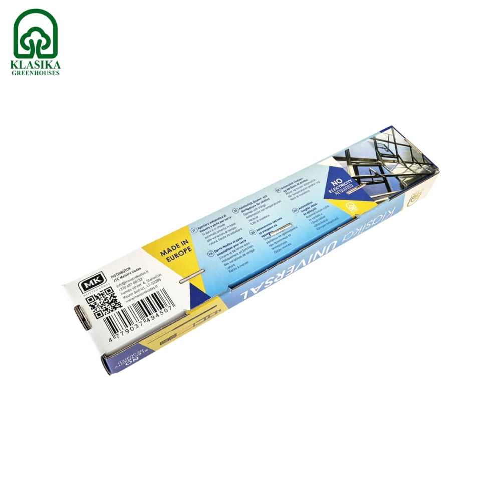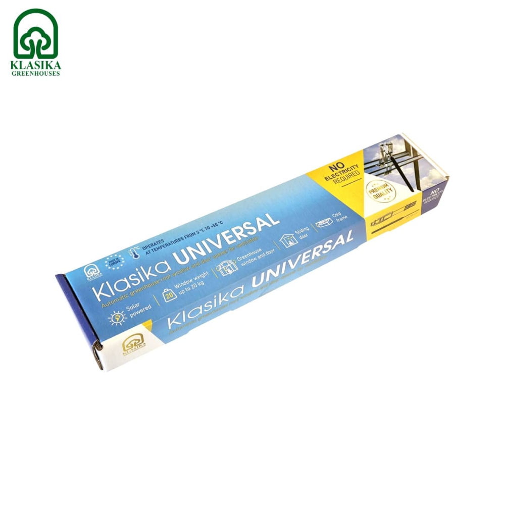 Klasika UNIVERSAL – tai patikimas, patogus ir visiškai autonominis sprendimas šiltnamių vėdinimui. Atidarytuvas automatiškai reguliuoja šiltnamių langų ar durų atsidarymą ir užsidarymą priklausomai nuo oro temperatūros – visiškai be elektros energijos!