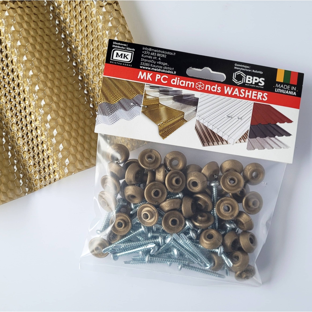Varžtai skirti dangos montavimui prie medinių arba metalinių konstrukcijų. Tinka naudoti MK PC DIAMONDS monolitinio polikarbonato dangai (SINUS, Tile Effect), PVC ir PET dangai, kanaliniam polikarbonatui, akrilui, banguotiems bituminiams lakštams, skardai ir šiferiui. Tarpinės pritaikytos MK PC DIAMONDS terasos dangos spalvai – skaidrios, pilkos ir bronzinės.