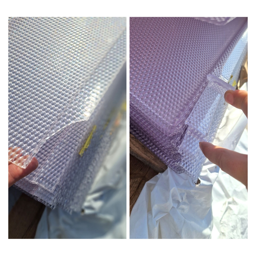 MK PC Diamonds Tile Effect skaidrus 0,954×4 m (dengiamas 0,90 m) – sugadinti kampai. Maksimalus pažeidimas iki 5-10 cm lapo krašte. Visi tokie lapai persidengtų vienas su kitu ir pažeidimo neliktų.