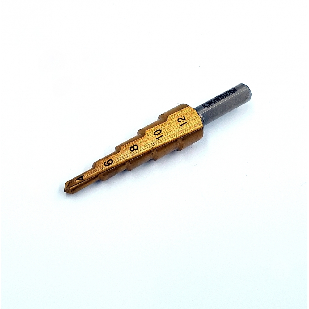 Pakopinis grąžtas (4, 6, 8, 10, 12 mm), skirtas medžiui, metalui, plastikui.