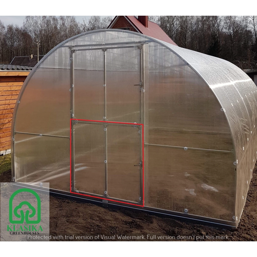 *Komplektuojant papildomas duris šiltnamiui KLASIKA TUBE, šiltnamio pirkimo metu, rinktis dangos storio nereikia. Pasirinkite, jog papildomos durys šiltnamio gale būtų „BE DANGOS”, nes papildomoms durims dangą išsipjausite iš polikarbonato lakštų pateiktų kartu su šiltnamiu.