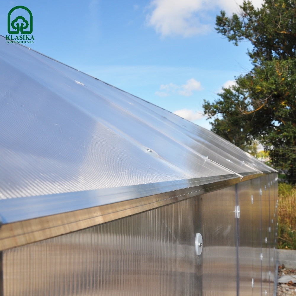 Dangai naudojamas tik kokybiškas, europietiškas, 6mm storio kanalinis polikarbonatas, kuris pasižymi atsparumu kenksmingiems UV spinduliams. Pasirinkę šiltnamį su polikarbonato danga, būsite ramūs dėl jo ilgaamžiškumo, kadangi dangai suteikiama net 10 metų gamintojo garantija.