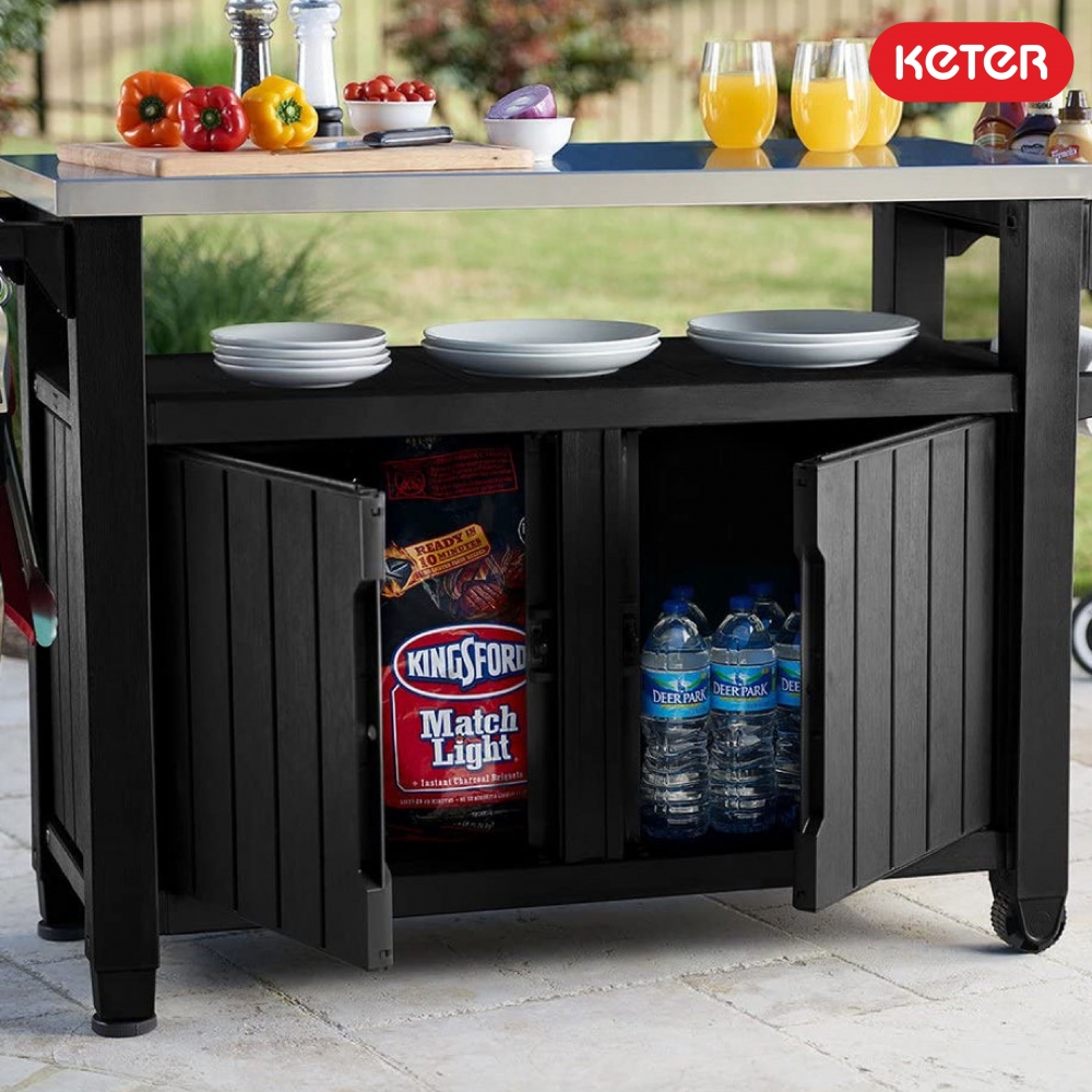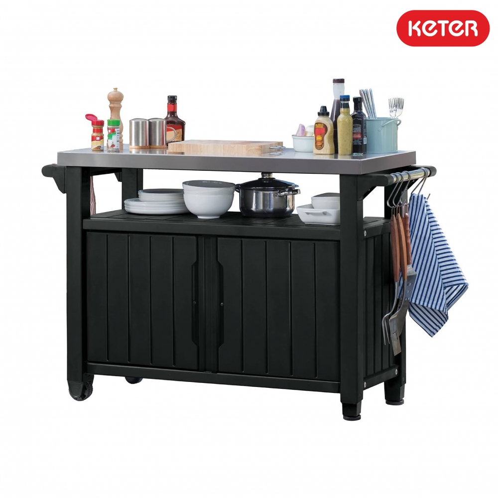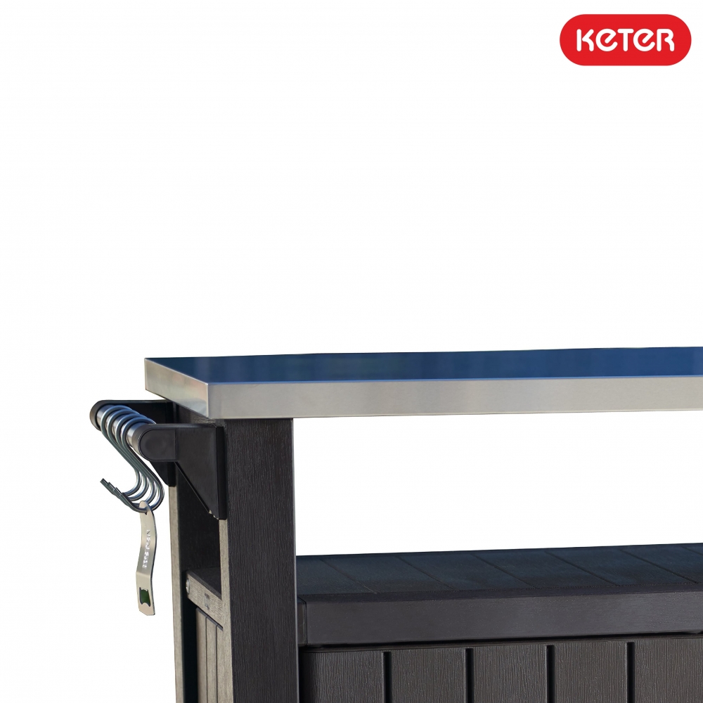 UNITY XL 207 L yra moderni, mobili daiktadėžė specialioms užduotims! Talpi dviejų durų spintelė su funkcionaliu nerūdijančio plieno stalviršiu ir patogi rankena su kabliukais rankšluosčiams, tiks rengiant didelius šeimos susitikimus terasoje ar sode. Joje laisvai sutilps indai, maisto produktai, gėrimai, virtės reikmenys ir daug kitų daiktų, reikalingų rengiant vakarienes ar barbekiu.